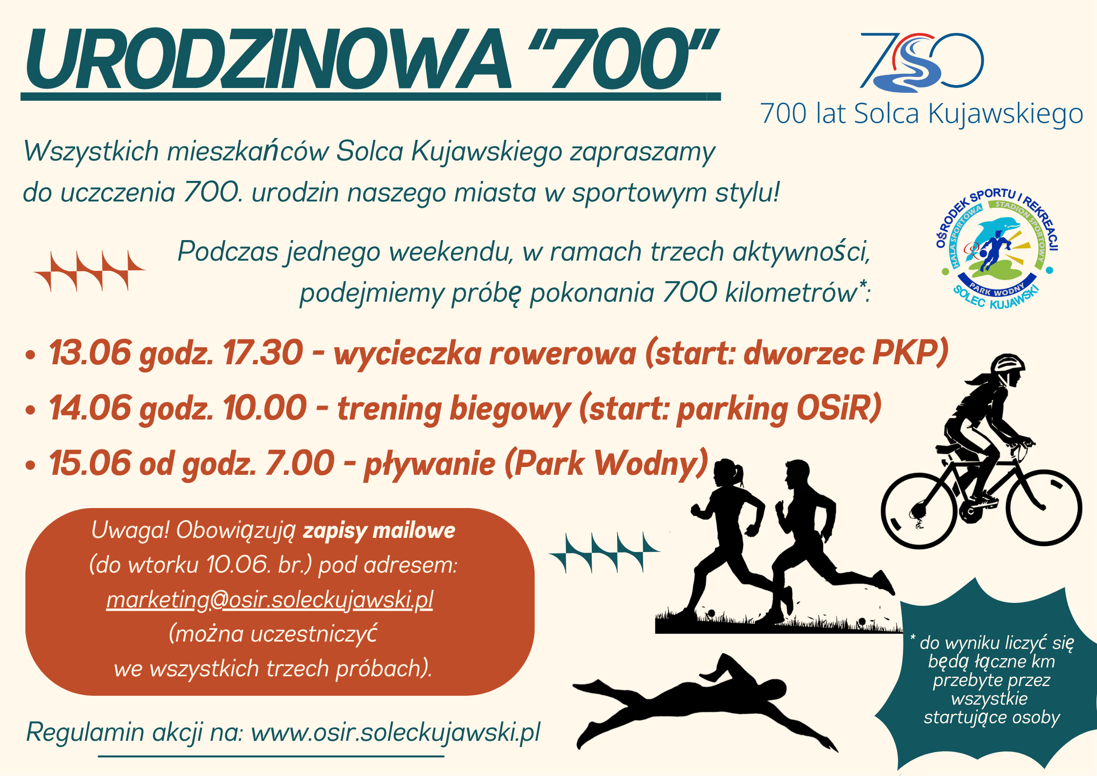 Ważne! Z uwagi na charakter akcji obowiązują zapisy mailowe (do wtorku 10.06 br.) pod adresem: marketing@osir.soleckujawski.pl (każdy może uczestniczyć we wszystkich trzech próbach).
